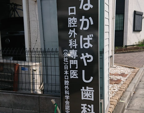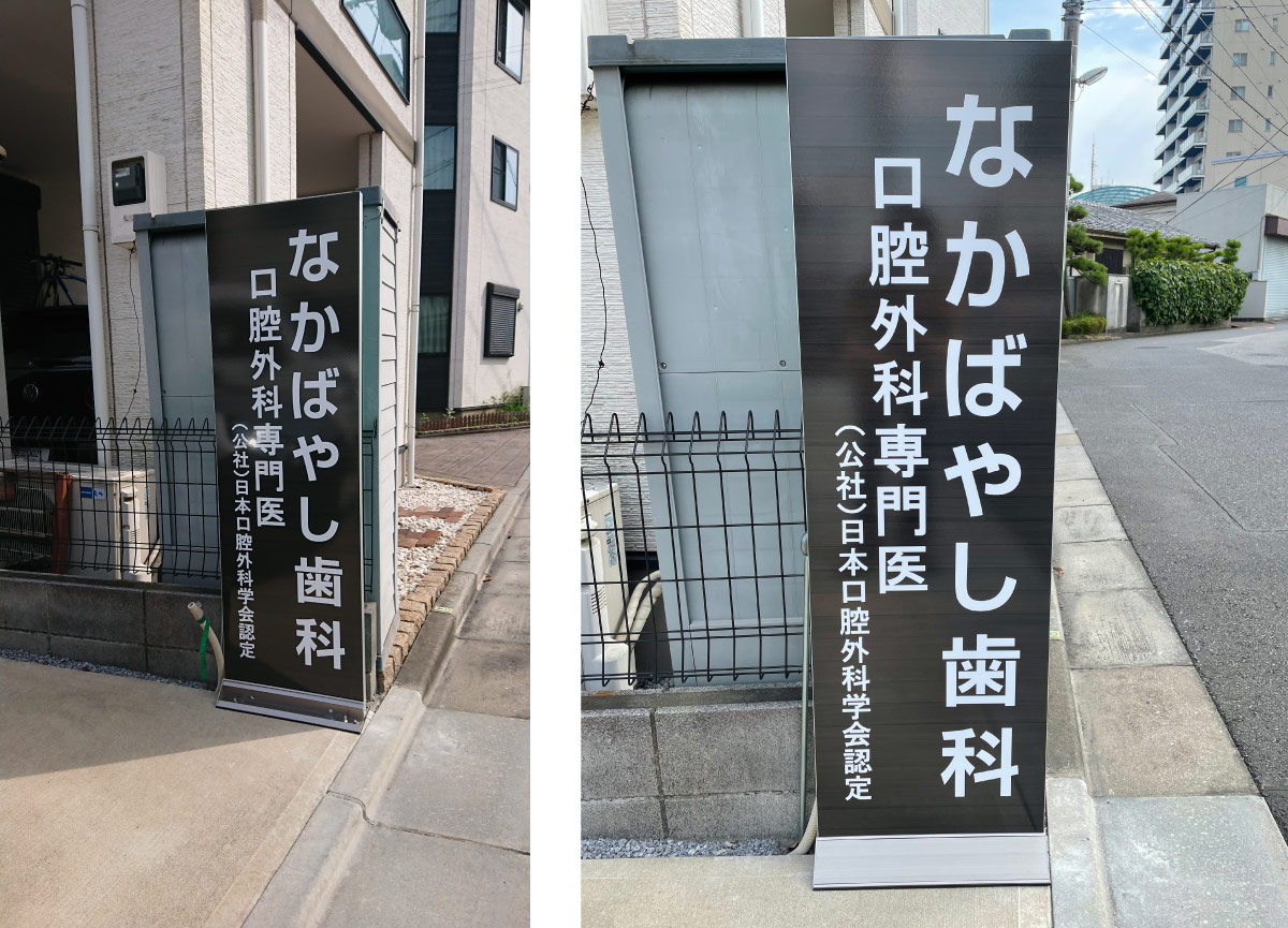 青戸4丁目にあります「なかばやし歯科」さまから、医院前のスペースに置き型看板のシート出力と貼り込み施工のご依頼をいただきました。逆側に設置してある看板に合わせて下地を木目調にレイアウト。通りから目立つよう濃い木目と白文字の組み合わせとなりました。