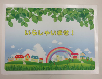 W1,820㎜×H540㎜のアルミ複合板へ塩ビシート+UVラミネート仕上げ。四隅と真ん中へ穴あけの加工もいたしました。