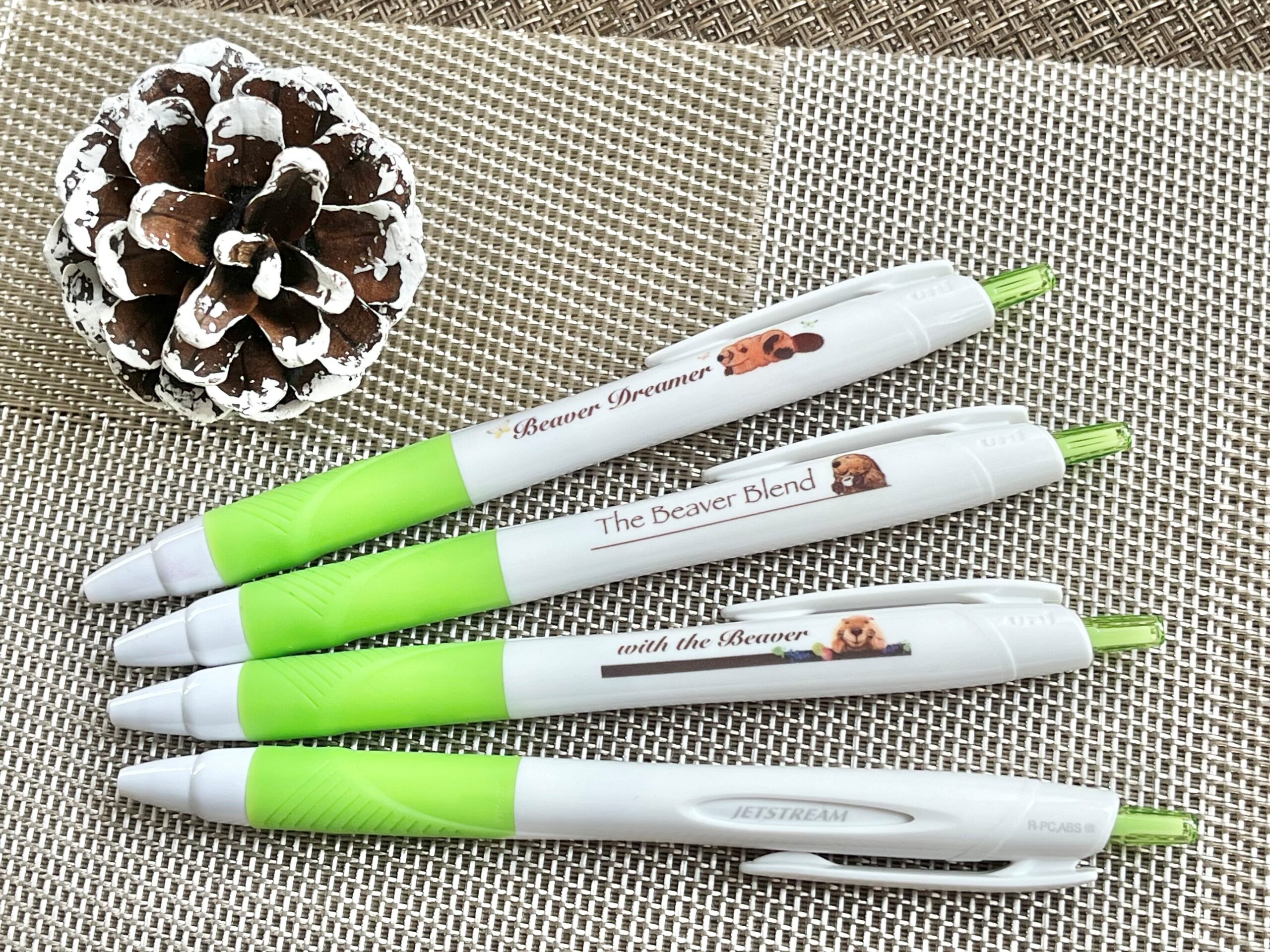 こあらゆうさんの依頼で弊社で印刷したビーバー柄JetStreamボールペンは、亀有ゆうろーど商店街「マカロン」ほか、ビーバーで有名な「阿蘇ファームランド」にも置いていただいているそうです。お近くの方はぜひ見つけてください。
