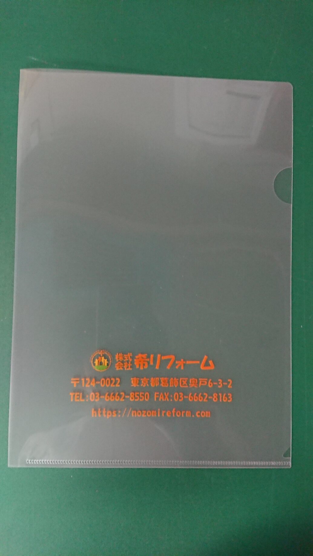 地元葛飾の株式会社 希リフォーム様からクリアファイル印刷のご依頼をいただきました。