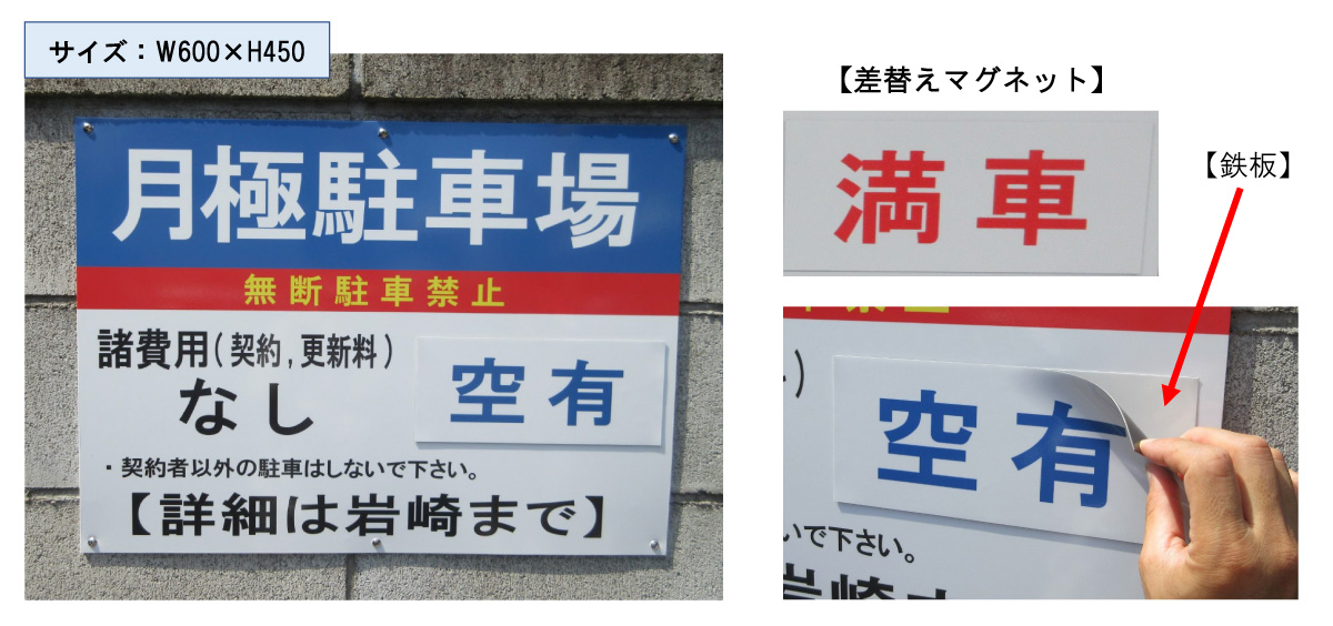当初「満車、空有」をレール付き差替えプレートでの提案でしたが、急遽マグネット仕様へ変更。密着度を上げるためマグネット接地面の下地にカットした鉄板を両面テープで貼り付け。レールが無い分スッキリした印象です。最後ブロック塀にビス止めして完成。